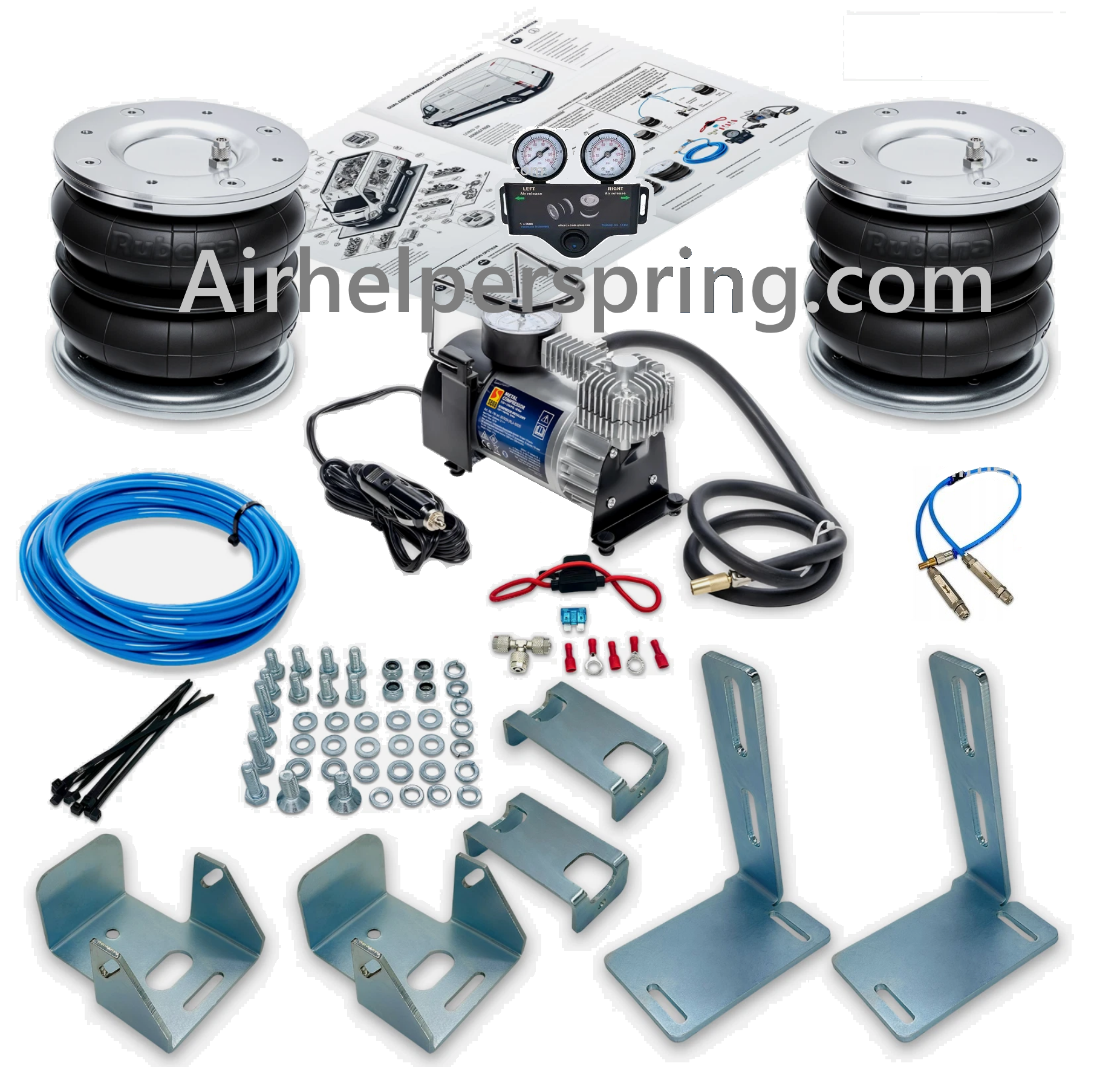The included 12V compressor is versatile, usable for tire inflation in emergencies. With a 5000 kg load capacity, this kit is ideal for commercial and leisure vehicles, provided with detailed instructions, galvanized mounts, and all necessary accessories for a quick, straightforward installation.